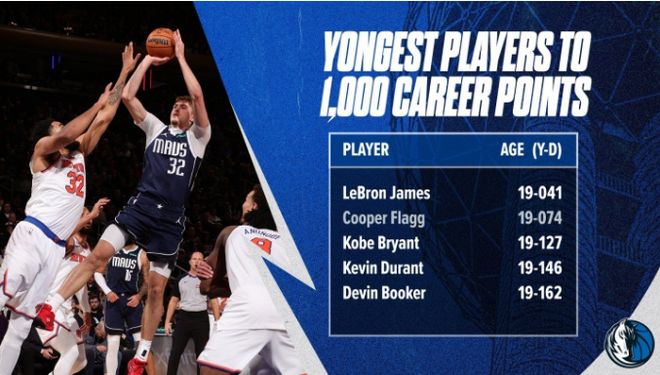 弗拉格因伤缺席8场后复出,他达成生涯1000分里程碑,且只有19岁74天创历史第二年轻纪录,仅次于詹姆斯19岁41天,超越科比19岁127天、杜兰特19岁146天、布克19岁162天。